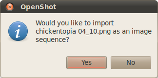 A new feature has been added to OpenShot which automatically detects that an image is part of an image sequence, and prompts the user (just to be sure). If the user chooses to import the entire image sequence, they just need to select "Yes" on the prompt (pictured above).