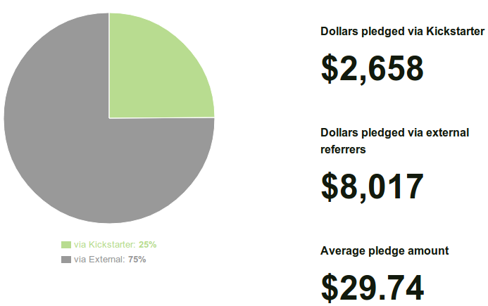 Take a look at the breakdown of backers we've received from external websites, as compared to backers from Kickstarter.com. We are holding steady at 75% external, 25% Kickstarter.com, which I find very interesting. I really thought that Kickstarter would refer more people... once the project picked up some momentum.